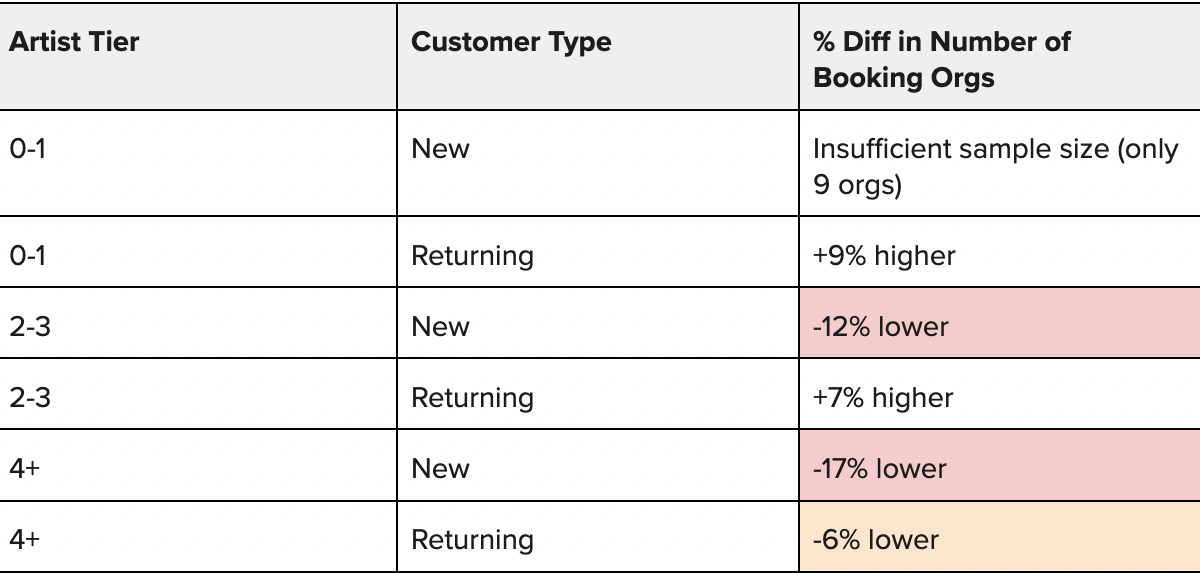 After seeing the initial results, the hypothesis was that either smaller artists, or new orgs that hadn’t booked before, were seeing a suggested budget number that was much higher than they are willing to spend, and abandoning the booking flow entirely instead of booking a lower budget.