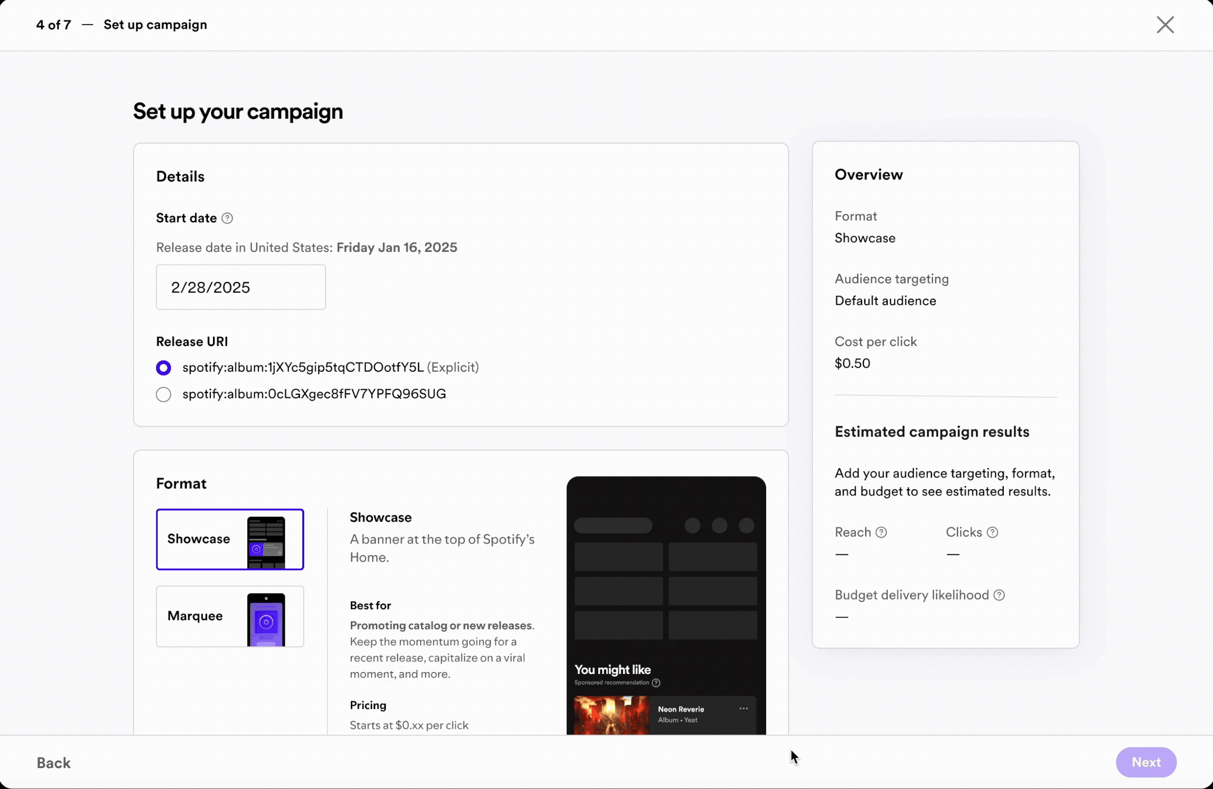 Artists and labels can book Marquee and Showcase campaigns via a booking flow on Spotify for Artists.