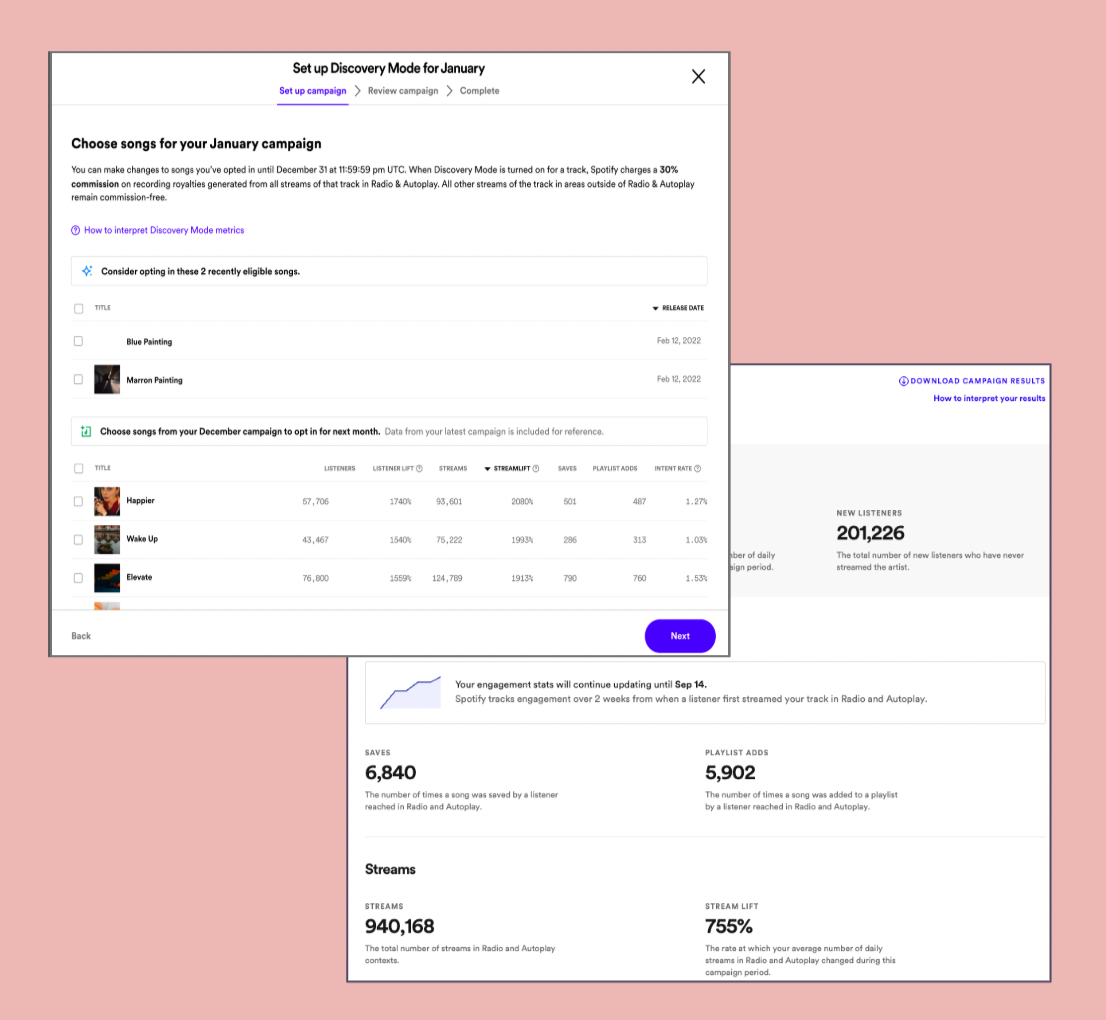 As a one of a kind promotional tool, Discovery Mode faced challenges in user comprehension. I identified key areas in the UX where comprehension was low which led to design and copy improvements including the addition of pre-campaign insights which provide users with recommendations as to which tracks they should opt-in.